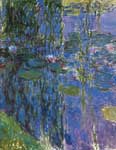 From 1890 Claude Monet concentrated on series of oil paintings in which he painted the same subject at different times of the day in different lights---Haystacks or Grainstacks (1890-91) and Rouen Cathedral (1891-95) are the best known. Increasingly his attention was focused on the celebrated water-garden he created at Giverny, which served as the theme for the series of oil paintings on Water Lilies that began in 1899 and grew to dominate his work completely (in 1914 he had a special studio built in the grounds of his house so he could work on the huge canvases).