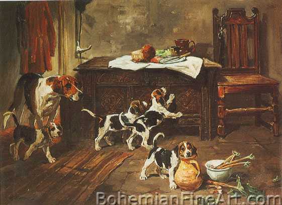 John Emms, A Hound and Puppies in an Interior Fine Art Reproduction Oil Painting